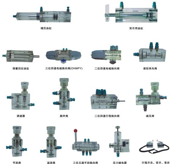 4、实训元件均为透明有机材料制成,便于了解掌握几十种常用液压元件的结构,性能及用途。掌握几十种基本回路的工作原理,实训组装回路快捷、方便。
